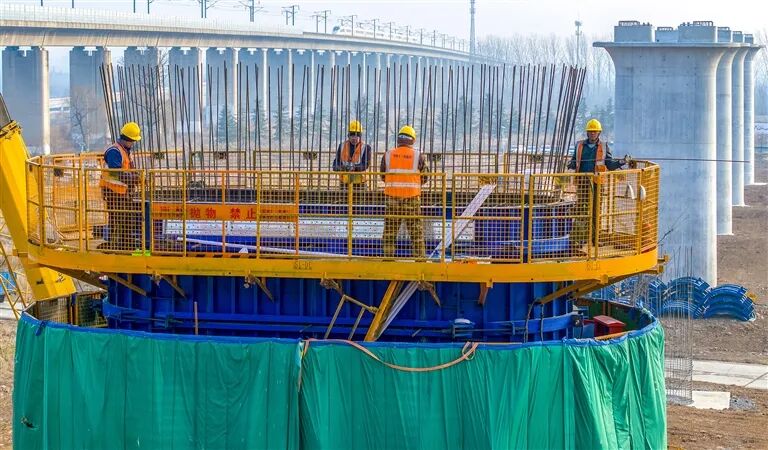 1月3日,在位于洛陽市的焦洛平高鐵洛河特大橋建設現場,工人們堅守崗位進行橋墩施工,抓進度、保節點,全力保障工程按時推進。張怡熙 攝